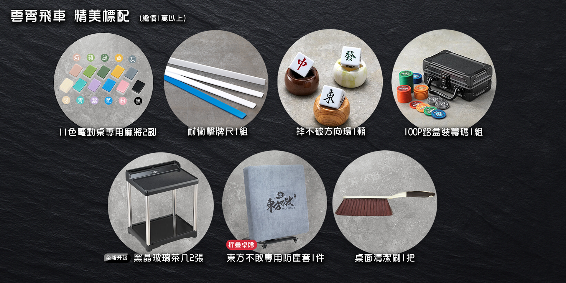 ▸折疊桌標配:電動桌專用麻將*2副、耐衝擊牌尺*1組、摔不破方向環*1顆、80P電動桌專用籌碼*1盒、桌面清潔刷*1把、桌邊旋轉置杯架*4個、東方不敗防塵套*1件。