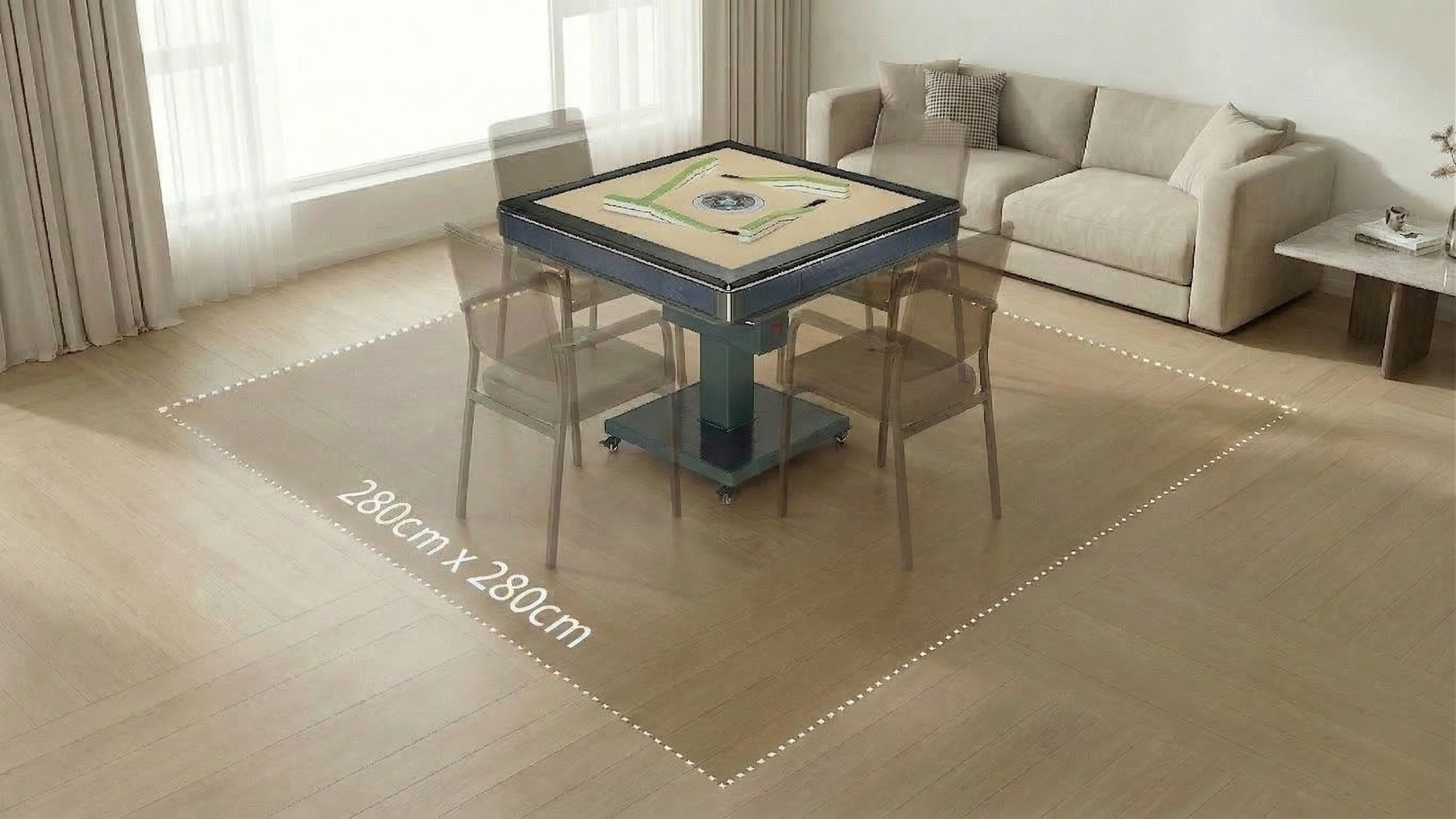 結論: 建議預留一個 280cm x 280cm 的正方形區域,這是打牌最舒適、毫無壓迫感的黃金尺寸。