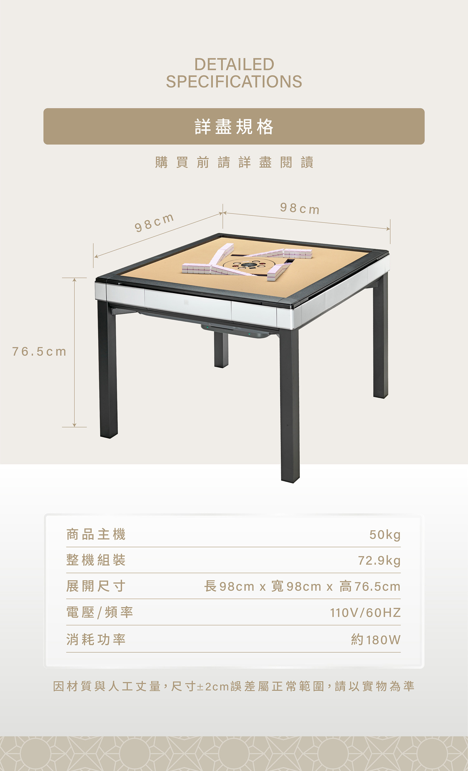 【36MM電動麻將桌麻將】與手打麻將相異,其尺寸為36x26X19mm